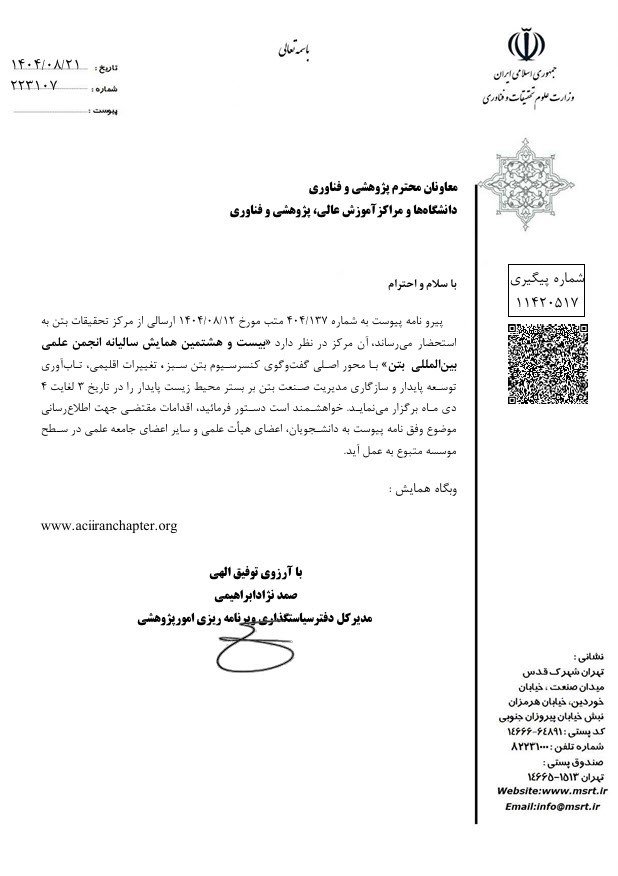 مرکز تحقیقات بتن (متب) از تمامی دانشگاه‌ها و پژوهشگران کشور دعوت می‌کند در این رویداد علمی بزرگ حضور یافته و در مسیر ارتقای دانش مهندسی سازه و توسعه پایدار کشور نقش‌آفرین باشند.
